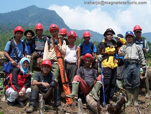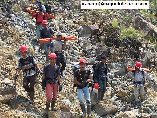My crew carrying MT equipments over hydrothermally altered ground in Sumatra Jungle. The light brown material is oxide-rich soil, while the gray material is argillic clays.