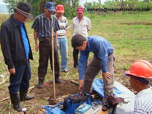 Sometimes, local villagers have the eager to know magnetotellurics also. So, here I am, in blue shirt, pointing out the 5-channel recorder that we use.