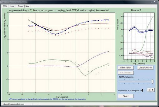 Gladiola is a free win32 application for MT static shift correction. The program reads MT EDI files and uses a given shallow structure (from TDEM or DC Resistivity) to produce the theoretical undisturbed MT tensor. The following figure shows the screenshot of the Gladiola. The plots are based on a synthetic dataset. The left panel is rhoapp as a function of period T, while the right panel is the corresponding phase . Blue dots on the left panel stand for rhoxy, the red pluses stand for rhoyx, and the black dots with line represent the TDEM derived MT curve. The solid blue line is the corrected rhoxy, while the solid red line is the corrected rhoyx. The points that have very low values are the rhoxx and rhoyy.