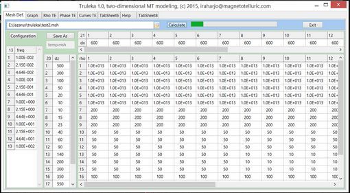 Truleka is a simple 2-D MT forward modeling software. At the moment, this finite difference software simulates TE (Transverse Electric) response of a 2-D grid. The grid uses flat earth, i.e. topography is not included. The figure below shows how the geomtery and the resistivity of the grid are designed.