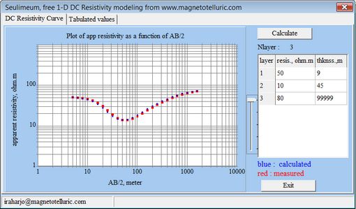 Seulimeum is a free 1-D DC Resitivity modeling software. The software runs under windows operating system. Simply, by just copying the data into the text editor, and the program is ready to calculate the theoretical response of the given model. The figure below shows the screenshot of Seulimeum.
