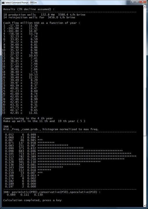 IRRSim is a free IRR Simulation, on the basis of MonteCarlo method. This console based application reads a text file containing the project parameters, then simulates the IRR and the cashflow. A paper discussing the program has been presented at the WGC Congress in Bali 2010 by Tony Gadhavi et.al. The figure below shows the screenshot of the application.