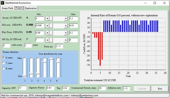 GTool is a free integrated tool for geothermal project design based on important parameters only. The use of the software has been presented in the World Geothermal Congress in Bali 2010 by Dona Rosalina, et.al. The figure below shows the screenshot of GTool. The uniqueness of this tool is the integration from the resource assessment, the field development, to the economic exercise, all in one spot, with just few clicks.